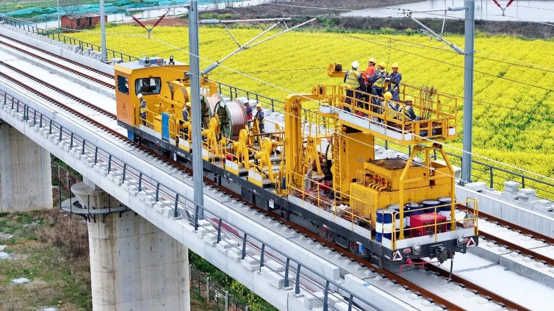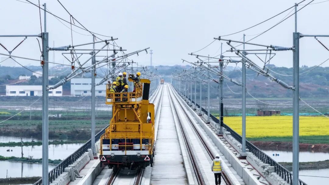接触网导线架设是昌九高铁建设从线下工程逐步转入线上电气设备安装的关键阶段。按照施工计划,昌九高铁全线将完成335.4公里的接触网导线架设任务,预计今年6月中旬全部完成。