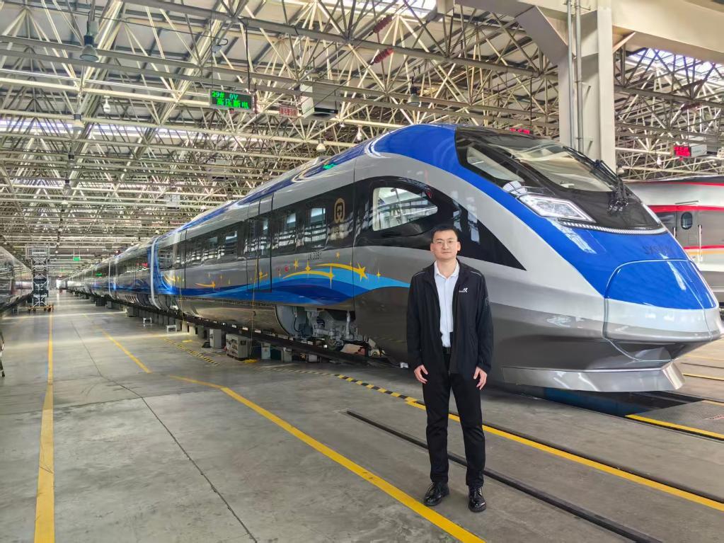 翟宇飞与京雄快线列车合影。新华社发
