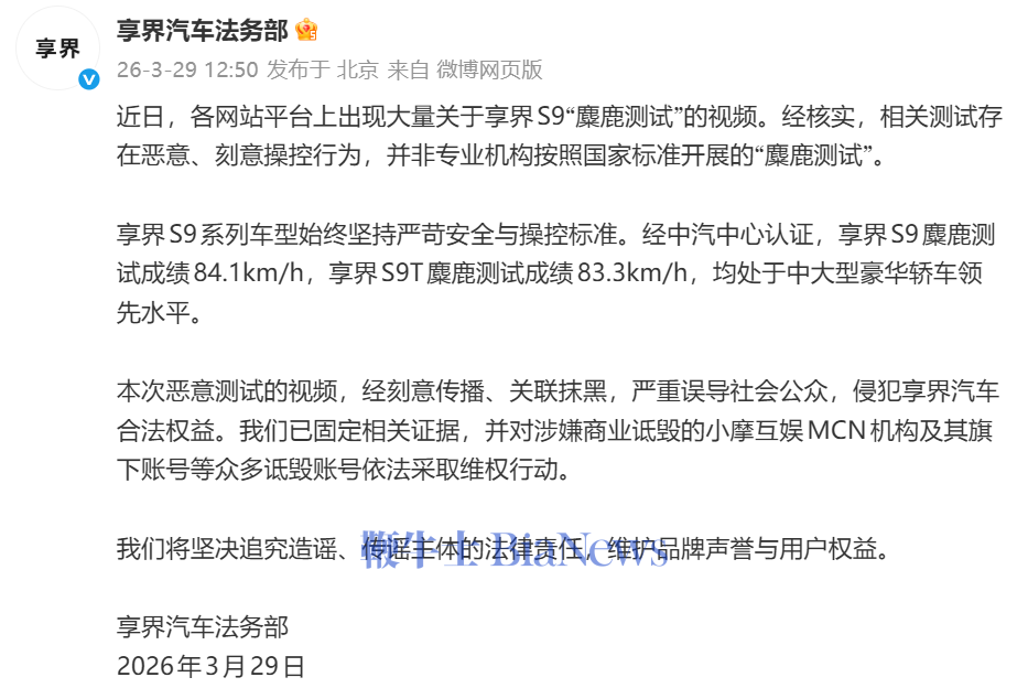 3月29日,享界汽车法务部今日发布声明称,近日,各网站平台上出现大量关于享界S9“麋鹿测试”的视频。经核实,相关测试存在恶意、刻意操控行为,并非专业机构按照国家标准开展的“麋鹿测试”。