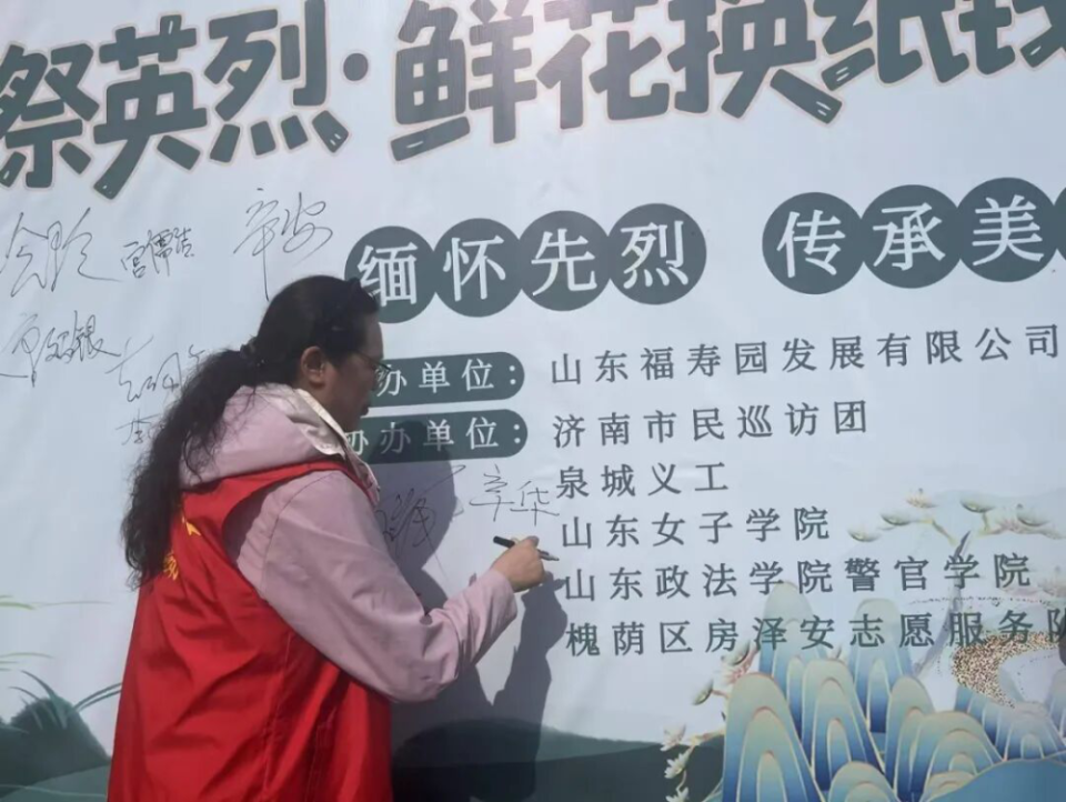 3月29日上午,“清明祭英烈·鲜花换纸钱·殡葬新风尚”主题活动在山东福寿园开展,泉城义工与济南市民巡访团、房泽安志愿服务团队、山东政法学院、山东女子学院等多方力量齐聚,全程参与活动各项流程,以志愿行动缅怀英烈、倡树新风。