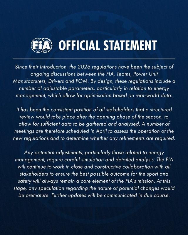 随后,FIA发布了官方声明,表示将在没有比赛的四月份开会,考虑是否要对新规下的能量参数进行调整。