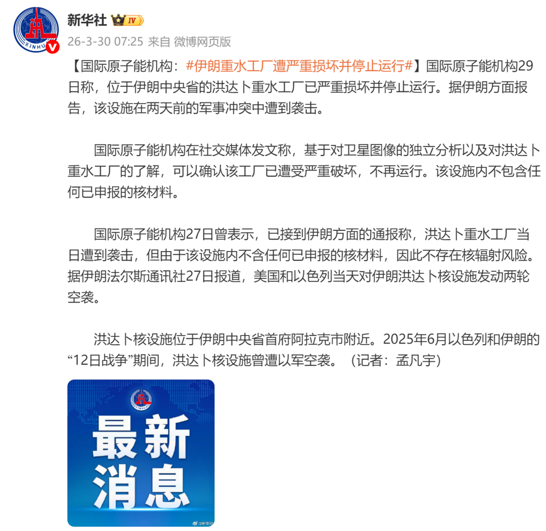 国际原子能机构在社交媒体发文称,基于对卫星图像的独立分析以及对洪达卜重水工厂的了解,可以确认该工厂已遭受严重破坏,不再运行。该设施内不包含任何已申报的核材料。