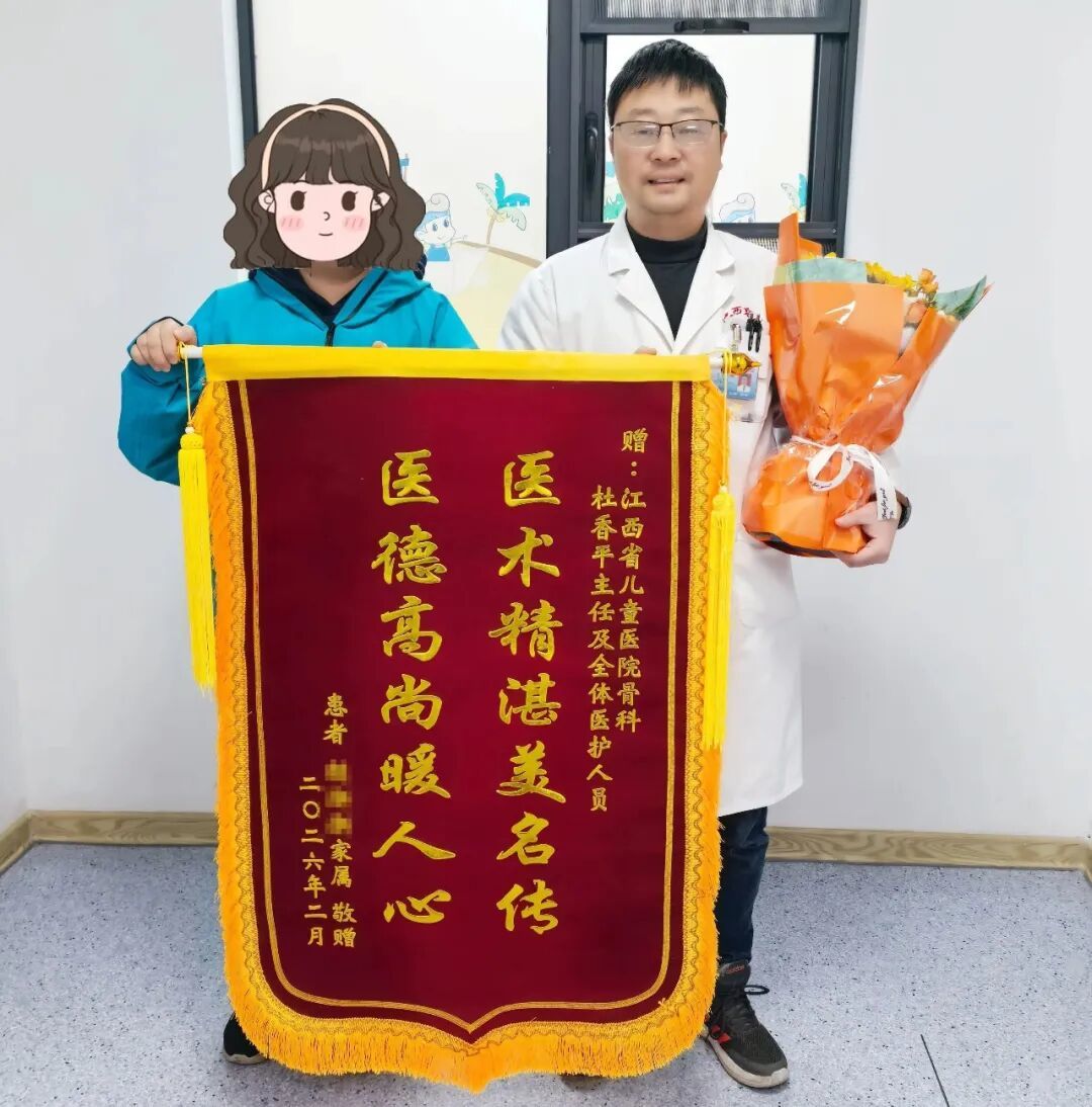 近日,江西省儿童医院骨科主任医师杜香平医护团队接连收到两面沉甸甸的锦旗。两名患儿顺利出院后,家属特意重返医院,向精心救治、暖心守护的骨科医护人员,送上最真挚的谢意。