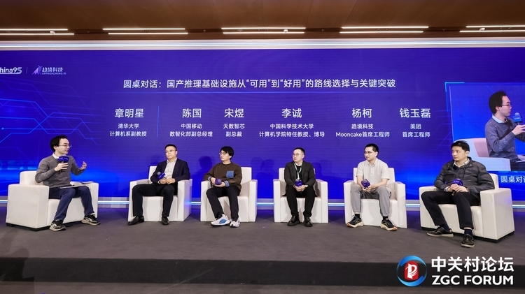 在圆桌对话环节,清华大学计算机系副教授章明星与中国移动数智化部副总经理陈国,天数智芯副总裁宋煜,中国科学技术大学计算机学院特任教授、博导李诚,美团首席工程师钱玉磊,趋境科技Mooncake首席工程师杨珂,围绕“国产推理基础设施从‘可用’到‘好用’的路线选择与关键突破”展开探讨。各方凝聚了三大共识:一是软硬深度协同是释放国产算力潜能的关键,需通过系统级优化弥合硬件性能与业务需求之间的鸿沟;二是生态统一与标准建设至关重要,打破“百花齐放”带来的适配难题,才能实现规模化应用;三是人才培养是产业根基,需通过开源社区、技术竞赛等方式,培育兼具理论与工程能力的AI Infra人才。
