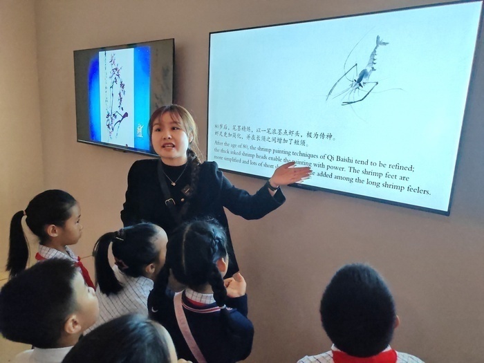 下午2时,活动准时开始。济南市历下区龙鼎实验学校美术教师亓鑫担任讲解,带领孩子们参观了“古今可师”“我行我道”“白石门下”三个单元。与寻常参观不同,亓鑫没有平铺直叙,而是一个接一个地抛出鲜活的问题:“这幅画中为什么只有鱼尾,没有鱼头?”“齐白石爷爷早期画虾和后期画虾,有什么不同?”……一个个有趣的问题,像一把把钥匙,打开了孩子们观察与思考的大门。在《墨虾图》前,孩子们久久驻足,被笔墨间流淌的生命力深深震撼。