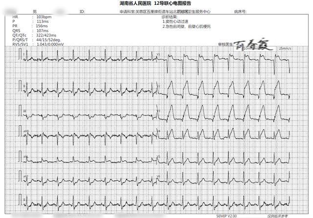 “结果初步诊断为急性前间壁、前壁心肌梗死,情况危急,需及时救治!”经常胸闷、胸痛的曾先生来到长沙市芙蓉区车站北路社区卫生服务中心就诊,医生通过“远程心电会诊平台”上传了心电图结果,短短两分钟后,就收到了湖南省人民医院发来的红色预警。
