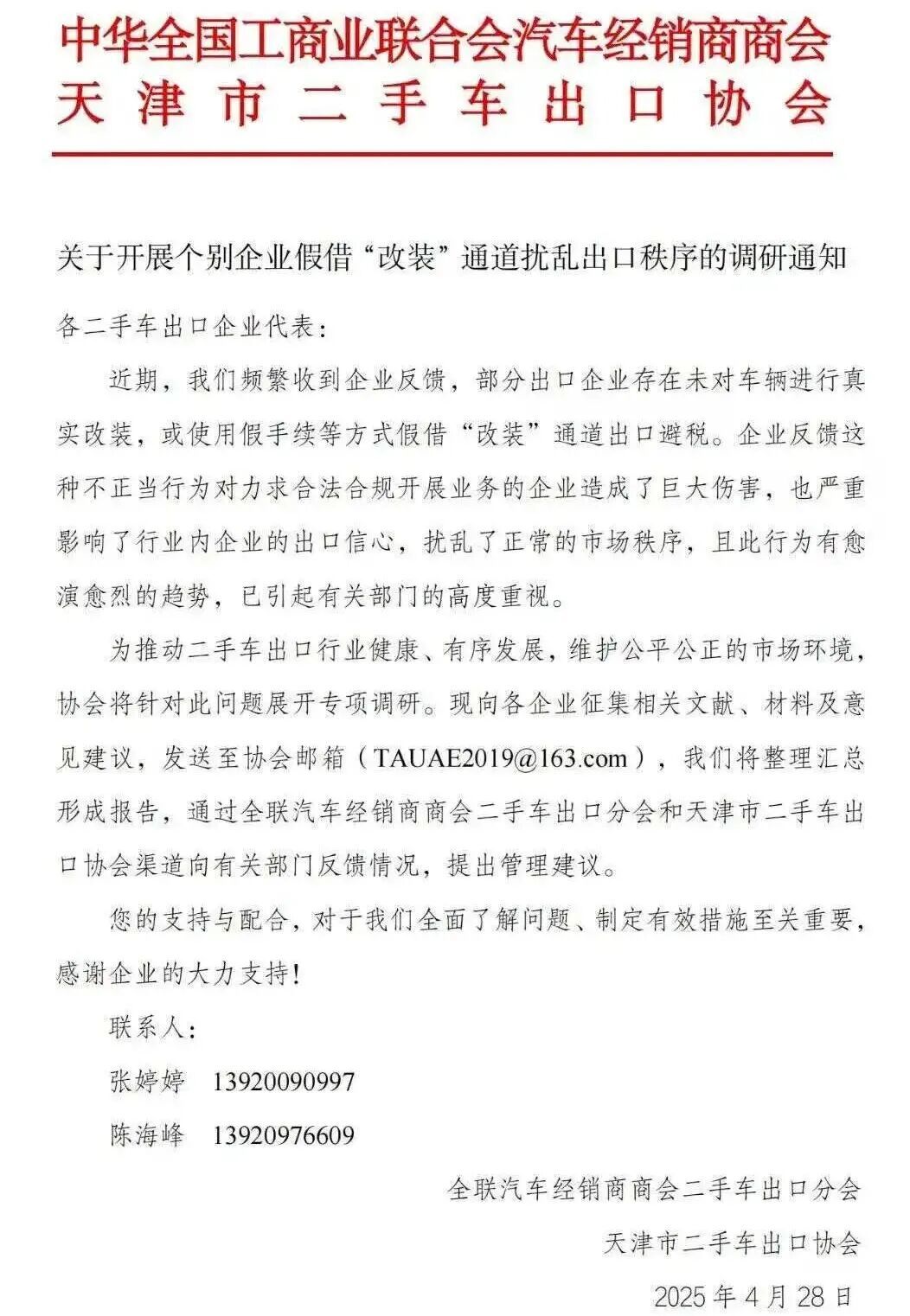 这种放纵也让改装车乱象频发。天津市二手车出口协会曾在去年发布通知表明,协会频繁收到企业反馈,部分出口企业存在未对车辆进行真实改装,或使用假手续等方式假借"改装"通道出口避税。企业反馈这种不正当行为对企业造成了巨大伤害,扰乱了正常的市场秩序,且此行为有愈演愈烈的趋势,已引起有关部门的高度重视。