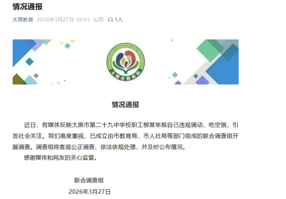3月27日,太原市教育局发布情况通报:近日,有媒体反映太原市第二十九中学校职工柳某举报自己违规调动、吃空饷,引发社会关注。我们高度重视,已成立由市教育局、市人社局等部门组成的联合调查组开展调查。调查组将客观公正调查、依法依规处理、及时公布情况。