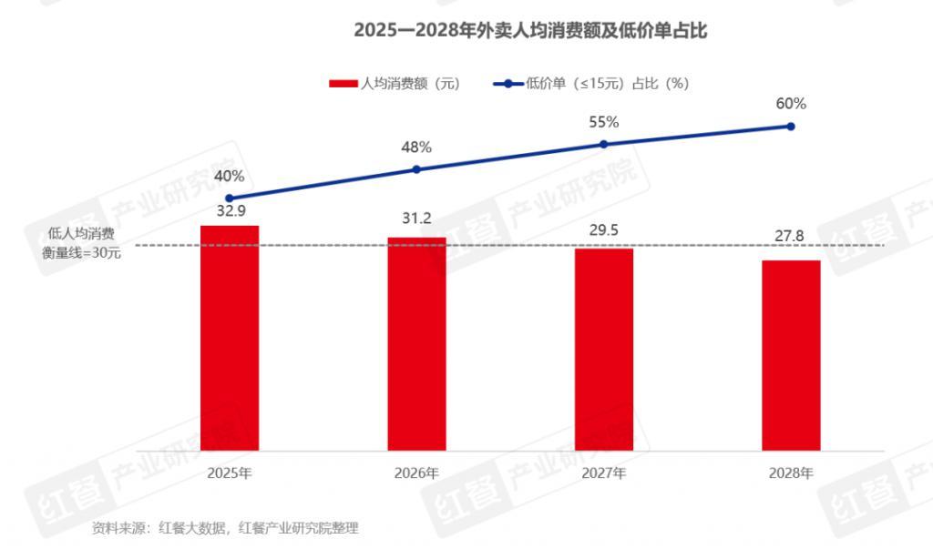 若外卖价格战持续,到 2028 年,每 10 笔外卖订单中将有 6 笔被锁定在 15 元以下的 " 低价单 "。价格下行从外卖端向堂食端持续外溢,全国人均餐饮消费下滑至 2028 年的 27.8 元。消费者低价心智一旦形成,平台即便退出补贴也将面临订单回落和用户流失的双重压力,补贴从可选的竞争工具演化为难以退出的结构性安排。