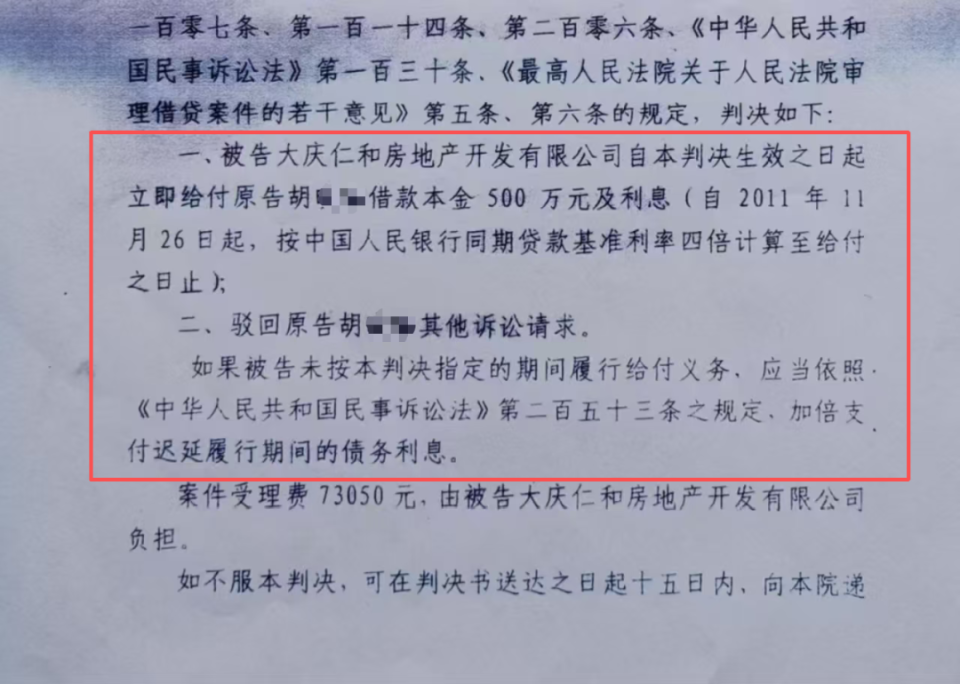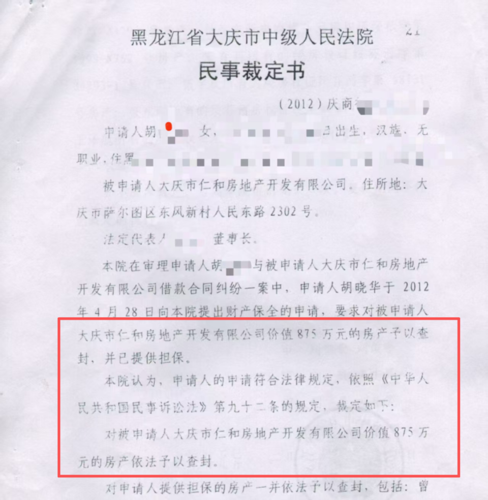2012年,胡女士将房地产公司告上法庭。黑龙江省大庆市中级人民法院民事裁定书显示,依法查封房地产公司开发的“远望松江小区”68套房产,判决她胜诉:房地产公司应偿还500万元本金及利息,若不能偿还,则以抵押房产折价或拍卖抵债。