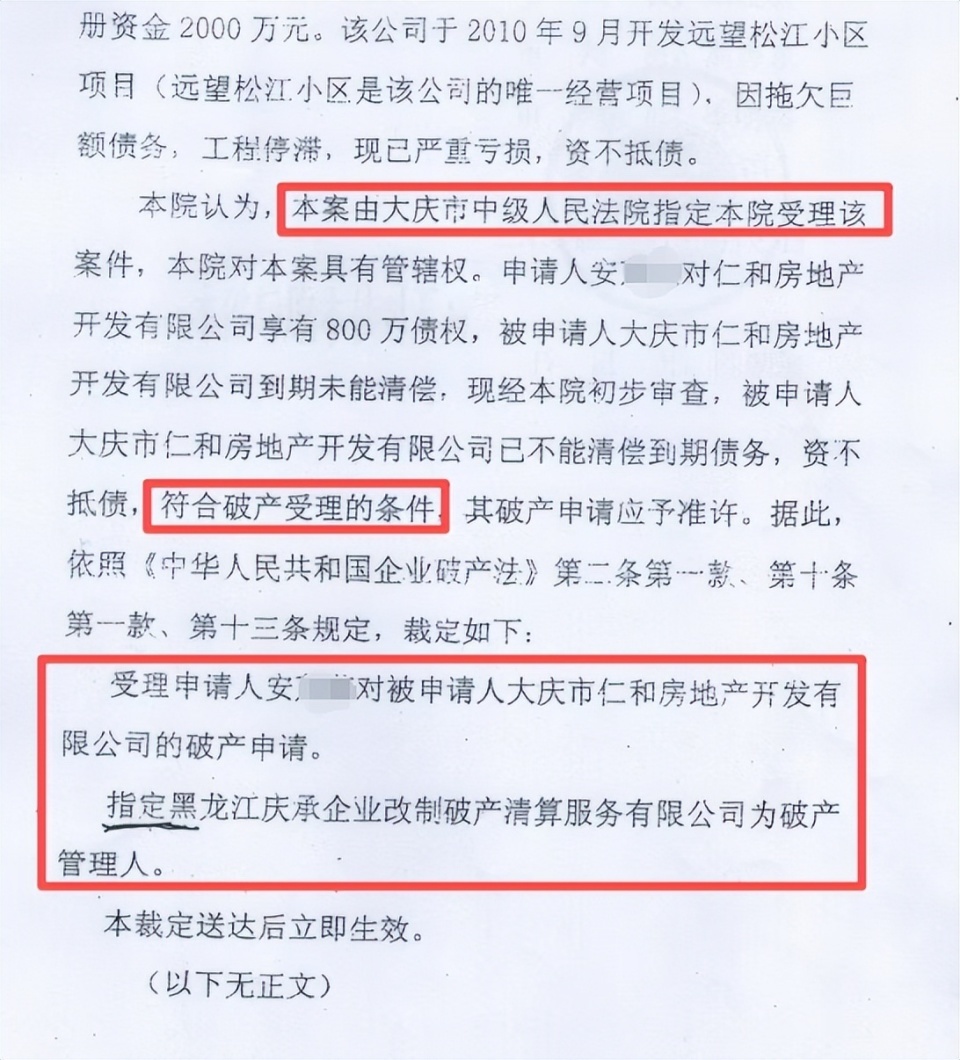 2014年,肇源县人民法院宣告房地产公司破产