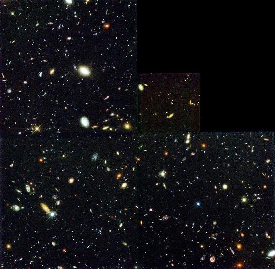 最初的哈勃深场图像首次揭示了一些最暗弱、最遥远的星系。在这片相当于伸直手臂时一枚邮票大小几分之一的天区中,发现了约3000个星系。只有通过多波段、长时间曝光观测极遥远的宇宙,我们才能揭示这些前所未见的天体。 致谢:R。Williams(太空望远镜科学研究所),哈勃深场团队美国国家航空航天局
