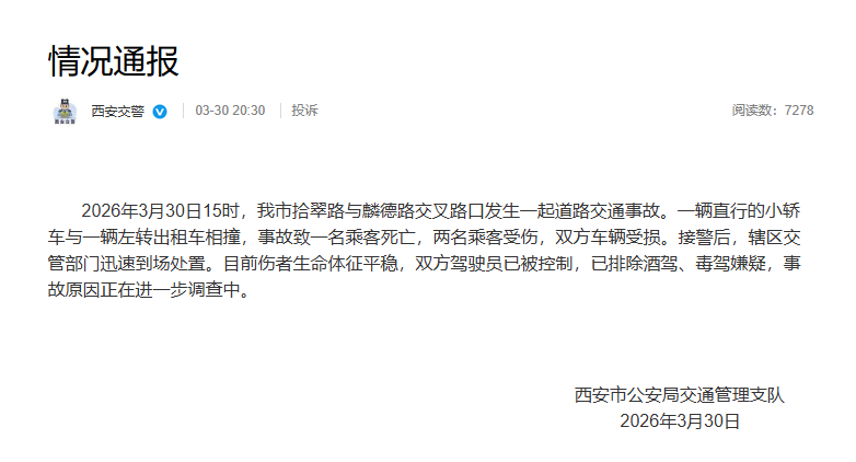 2026年3月30日15时,西安市拾翠路与麟德路交叉路口发生一起道路交通事故。一辆直行的小轿车与一辆左转出租车相撞,事故致一名乘客死亡,两名乘客受伤,双方车辆受损。接警后,辖区交管部门迅速到场处置。目前伤者生命体征平稳,双方驾驶员已被控制,已排除酒驾、毒驾嫌疑,事故原因正在进一步调查中。