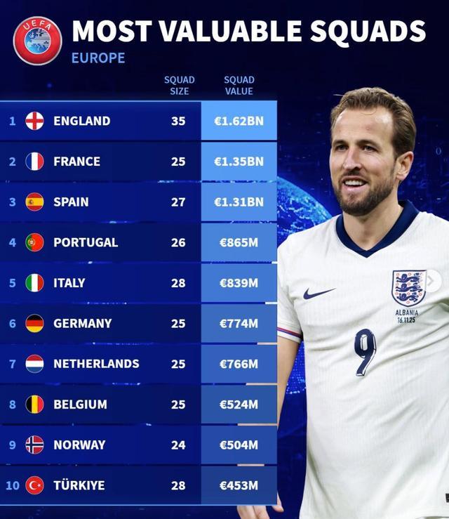 北京时间3月31日,德转列出了3月国际比赛欧洲国家队身价前10,英格兰代表队以16.2亿欧元高居第一,法国13.5亿欧元第二,西班牙13.1亿欧元第三,挪威和土耳其上榜。