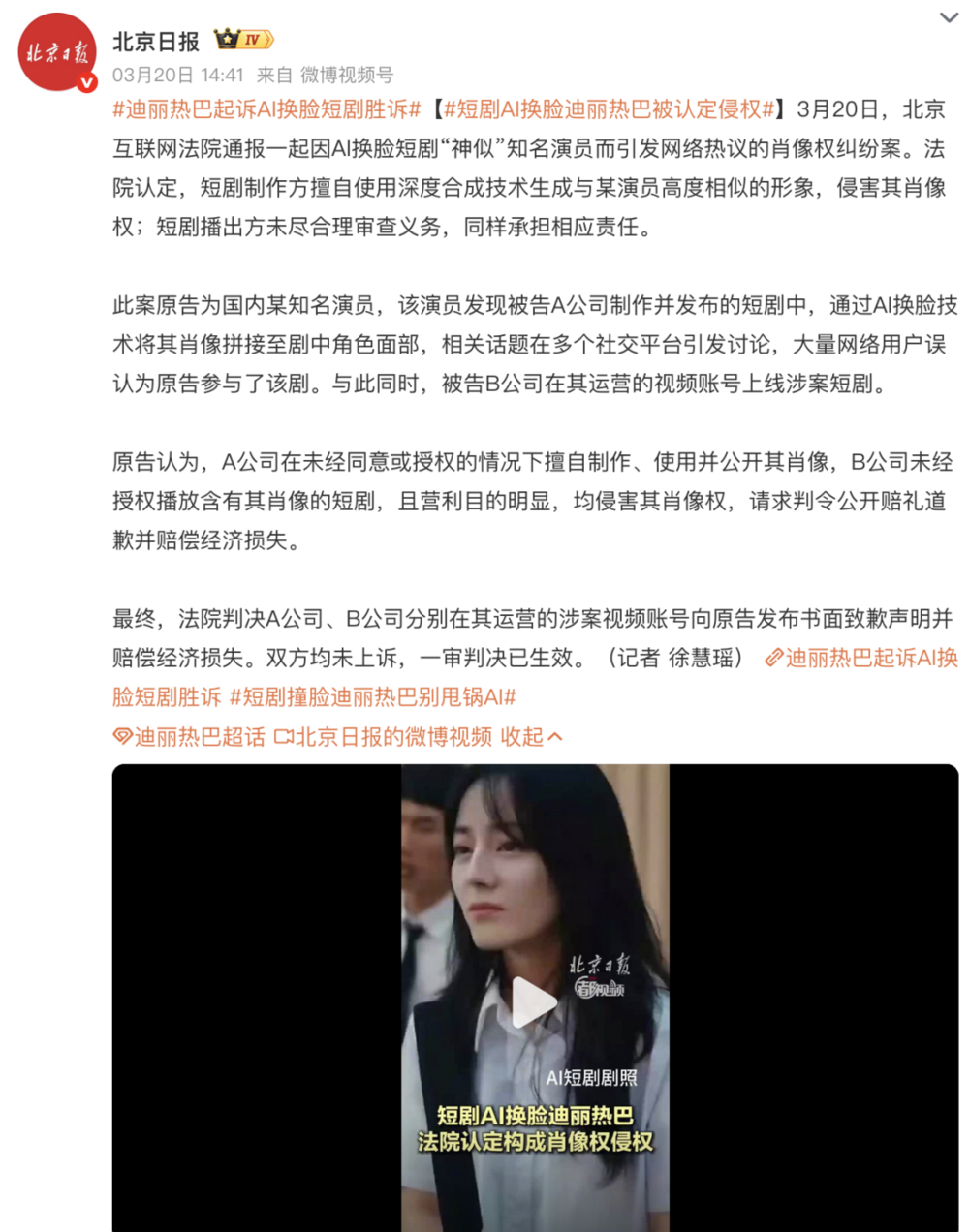 最终,北京互联网法院一审判决短剧制作方(阜阳志尚文化传媒有限公司)和播出方(杭州千炎万羽文化传播有限公司)侵犯肖像权,要求其公开致歉并赔偿经济损失。双方均未上诉,判决现已生效。