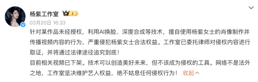 就在今年3月20日,迪丽热巴案件通报的同一天,另一位顶流女星杨紫的工作室也发布了强硬声明。声明直指某作品未经授权,利用AI换脸、深度合成等技术,擅自使用杨紫的肖像制作并传播视频内容,严重侵犯了其合法权益。