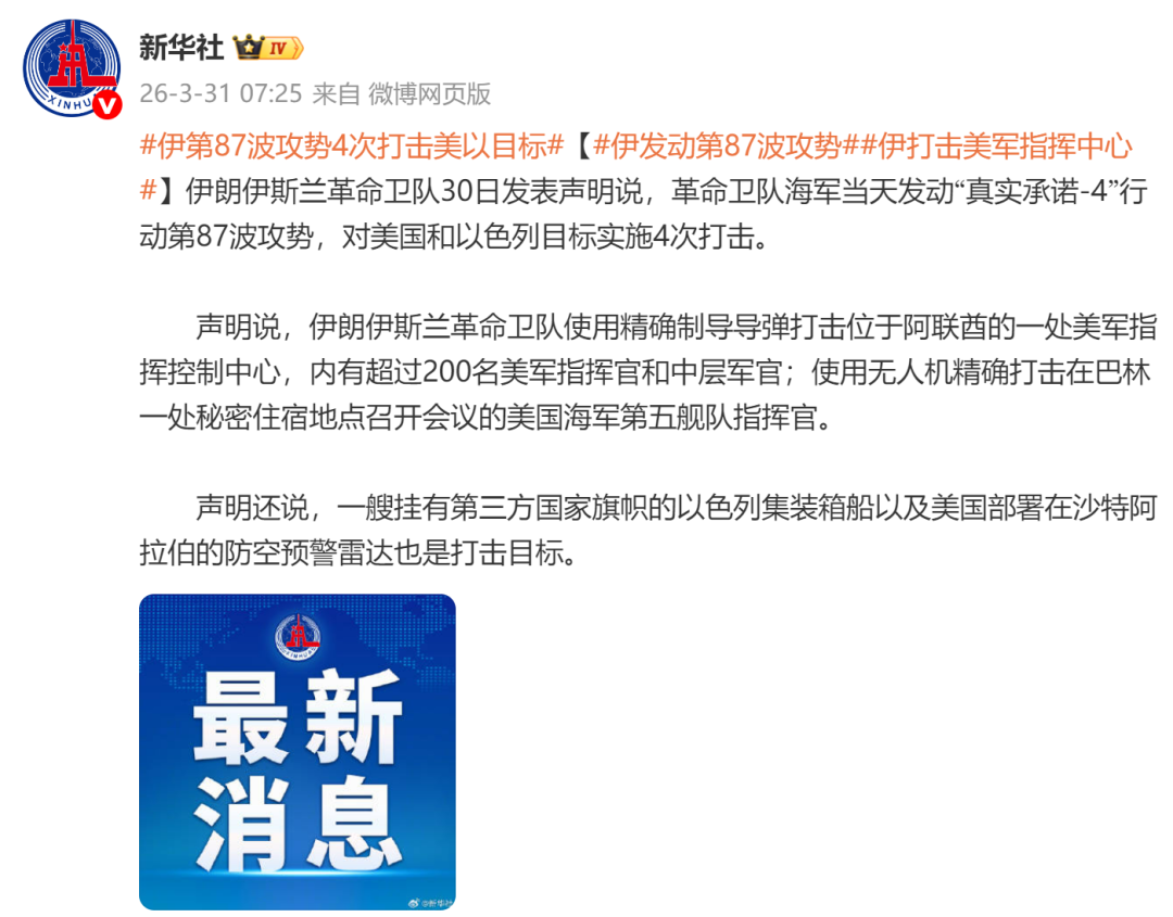 据新华社:伊朗伊斯兰革命卫队30日发表声明说,革命卫队海军当天发动“真实承诺-4”行动第87波攻势,对美国和以色列目标实施4次打击。