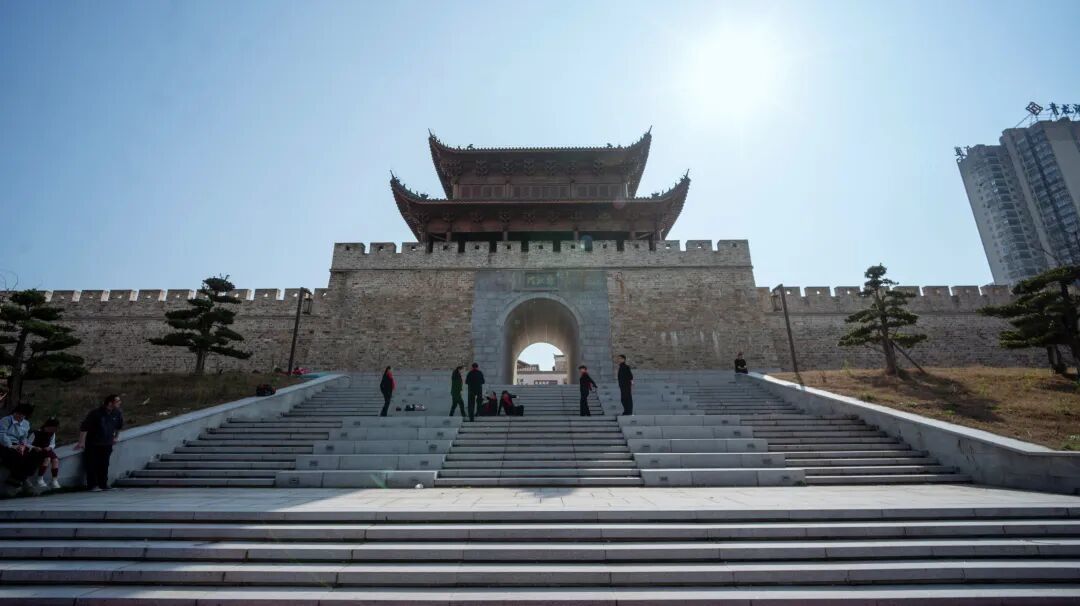 拾级登上城楼远眺