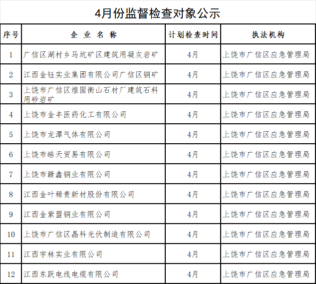 为进一步提升我区应急管理综合行政执法工作质效,做到严格、规范、公正、文明执法,按照《上饶市广信区应急管理局2026年度安全生产监督检查计划》,现将2026年4月执法对象和执法事项公示如下。