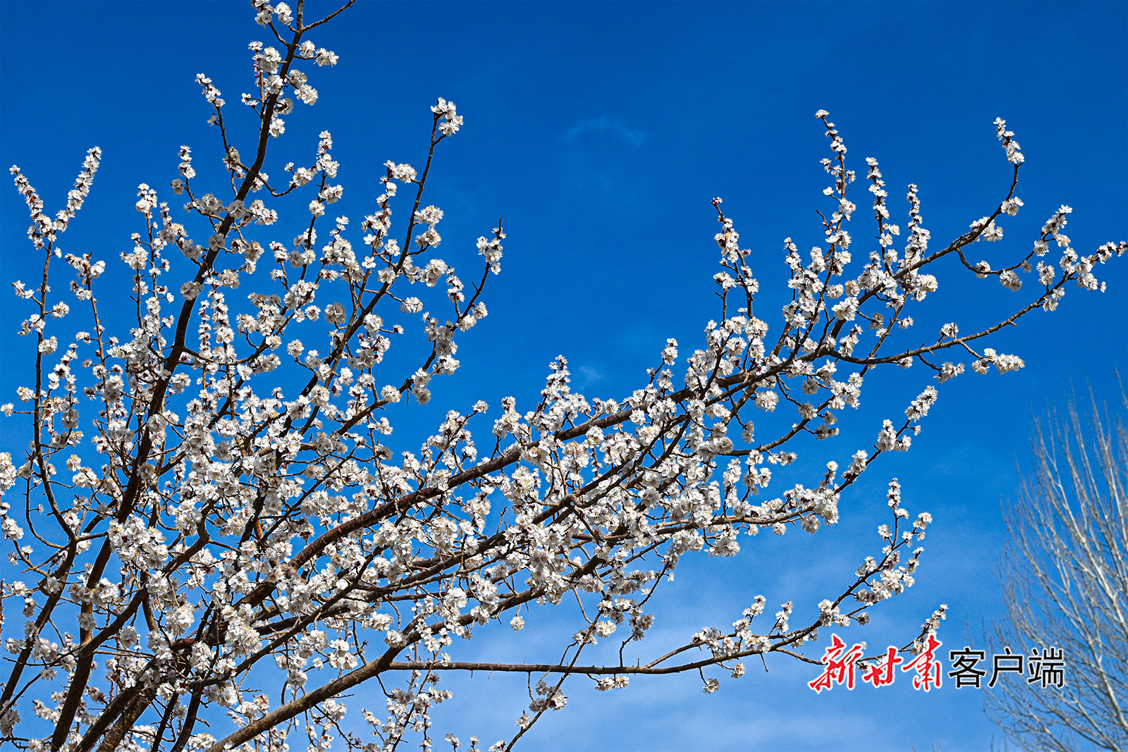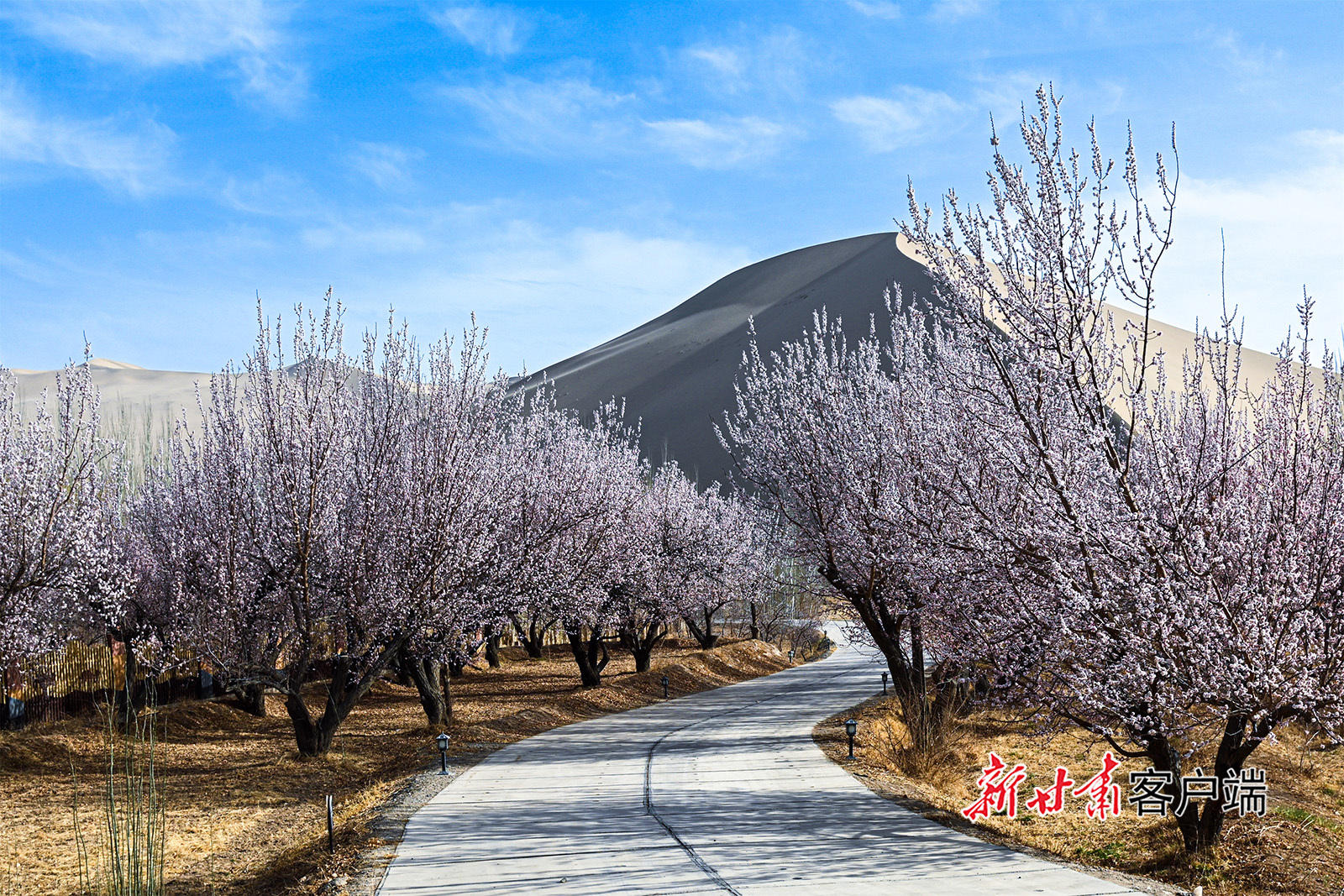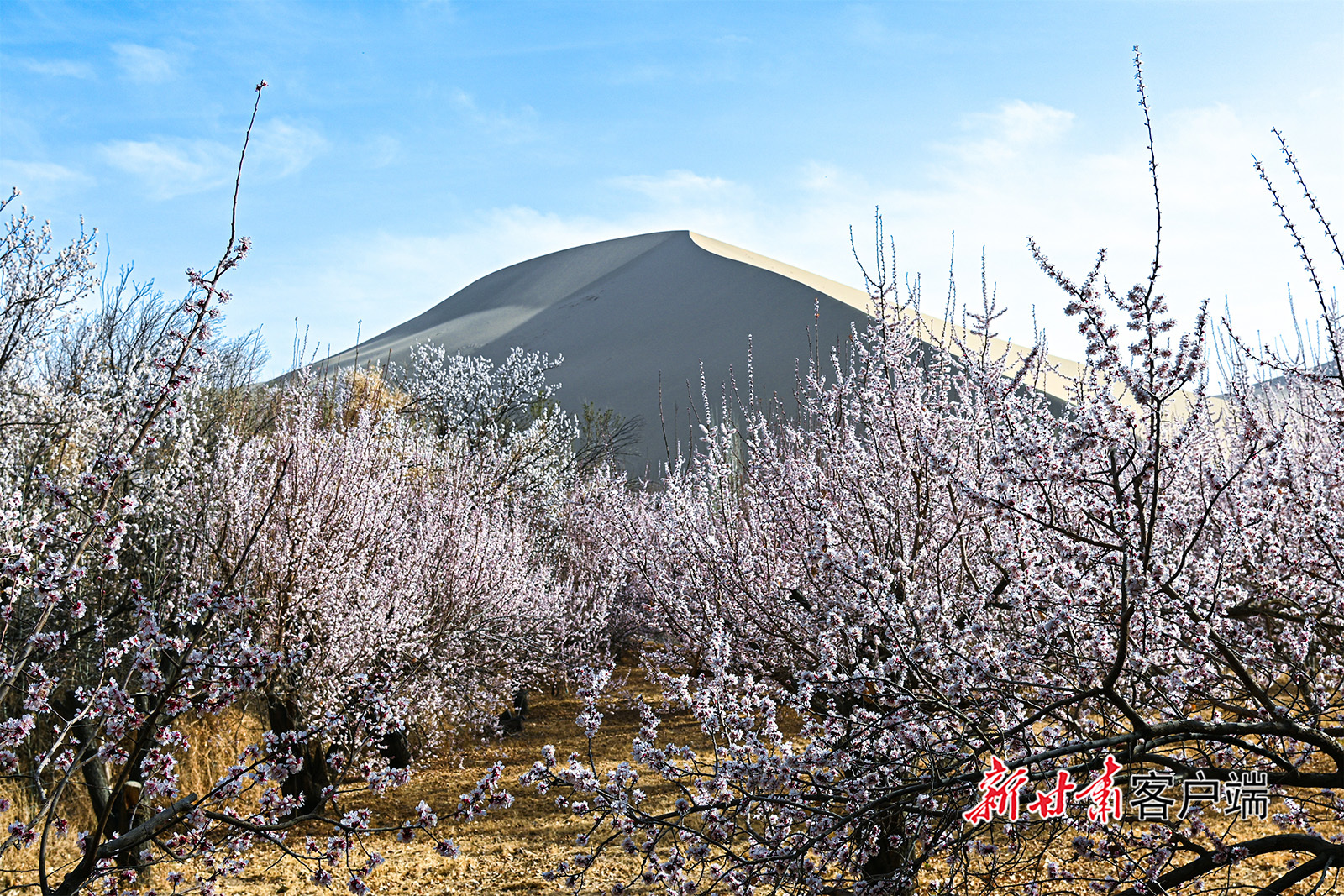 3月29日,敦煌市鸣沙山下千亩杏花次第绽放,勾勒出一幅美丽的春日画卷。