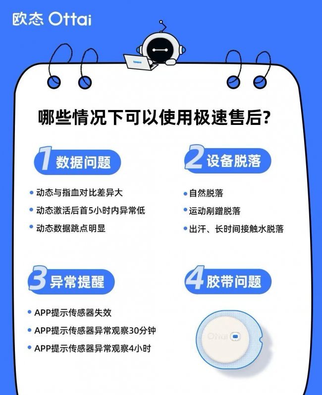 欧态 M8 本身有着过硬的产品实力,MARD 值低至 8.106%,远优于临床级标准,监测精准又靠谱,再加上 1.6g 的超轻机身,一元硬币大小,佩戴起来几乎无感,14 天长戴、洗澡游泳都不用摘,一体式设计老人也能轻松上手,是全程省心的健康管理。可万一遇到特殊情况,欧态的极速售后完全不用慌:现在已经上线免人工智能审核模式,不用排队等人工客服,直接在 APP 极速售后通道提交申请就行,系统 AI 快速核验,符合质保条件的,压根不用寄回故障设备,官方直接安排免费补发,彻底省掉来回寄件的时间。