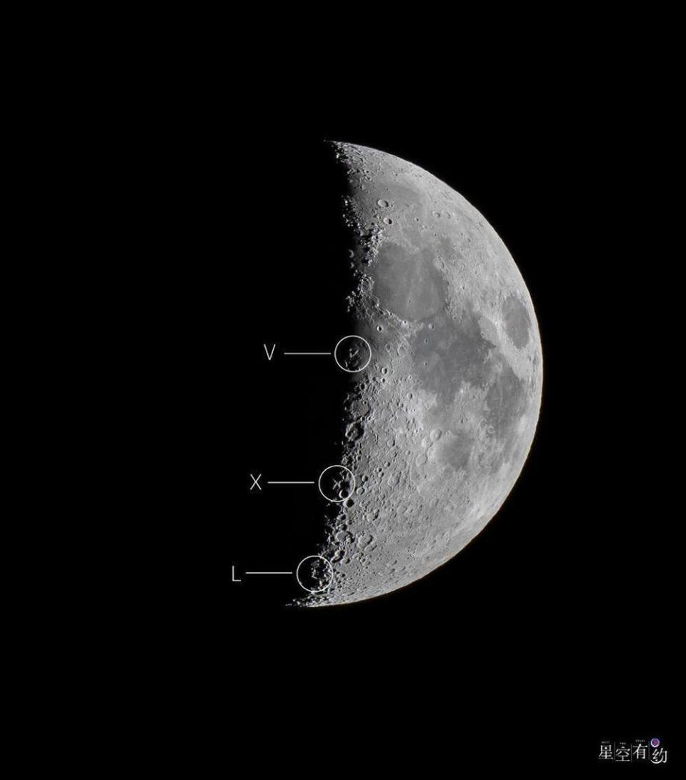4月24日,月球表面将同时浮现出类似字母“V”“X”“L”的光影,这是太阳光照射在月球上,导致月面环形山明暗交界处产生黑白对比的一种视觉效应。“19时至午夜是同时观测这几个月球上特殊画面的好时机,感兴趣的公众不要错过。”杨婧提醒说。