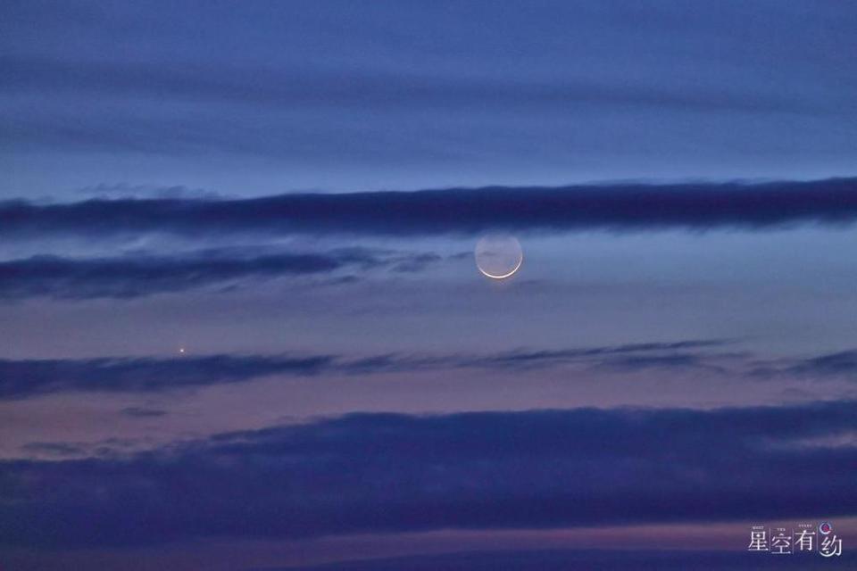 2026年3月20日傍晚,在黑龙江省同江市拍摄的金星伴月。(刘万平 摄)