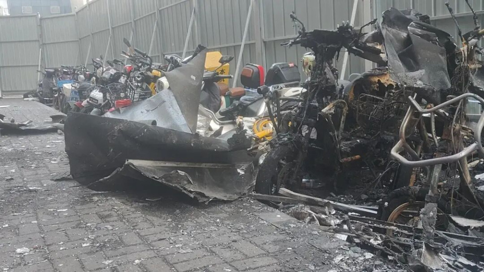 在店铺前停着一排电动车,也被烧毁得只剩下支架。
