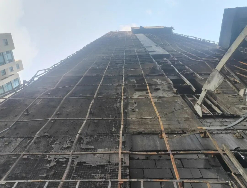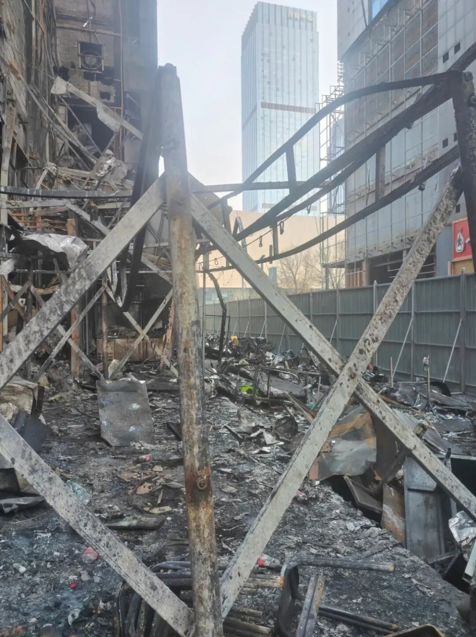 3月31日,记者进入事发现场内部。从外部看,原本延伸出大楼的主体的招牌支架已经被烧毁变形,留下一些金属框架。