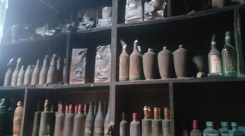 在转角楼川菜馆一楼,在门口的酒柜上,酒瓶上已经蒙上一层灰,很多已经无法辨别原来的品牌。