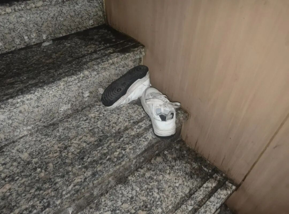 在一楼通往二楼的通道上,还留着一双白色板鞋,不知道是谁遗落在此。