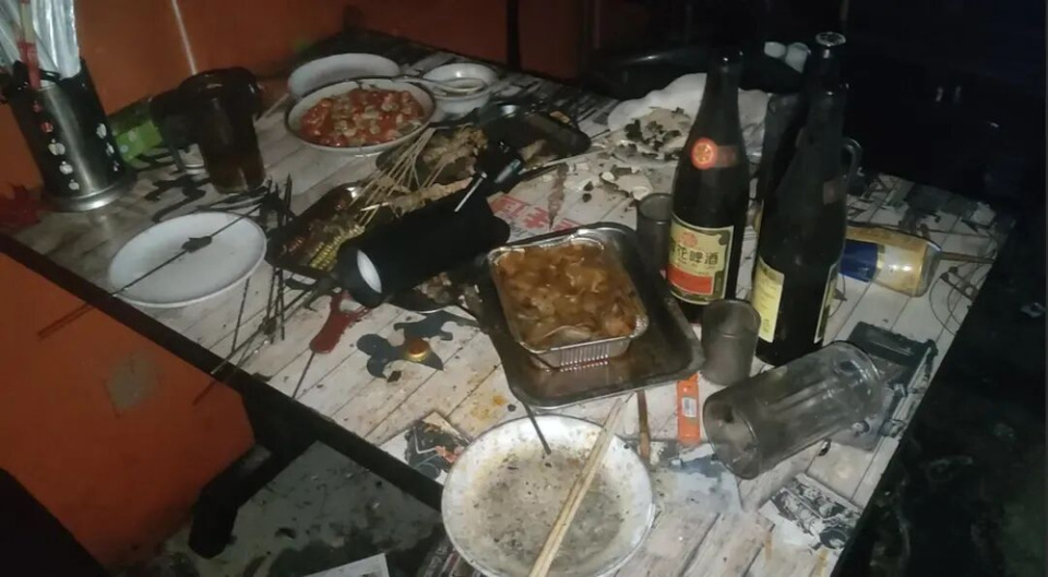 在大龙烧烤炒菜店门口,另有一个铁架梯子通往另一家小龙坎火锅店,这家火锅店位于大楼东北角,与大楼整体相连,有着更开放的空间和更多的逃生通道。在这家火锅店的一角,大圆桌上摆着还没有来得及吃的一大桌子菜。