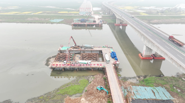 为确保主墩施工安全质量,项目团队超前谋划、科学部署,组织专家论证,不断优化施工方案,创新采用钢板桩围堰和水下混凝土封底工艺技术,有效解决了深水作业中基坑防护、封底密实度等关键问题。施工过程中,项目团队严格落实质量管控体系,每一个环节都精益求精、严格把关。针对大体积混凝土浇筑易产生裂缝的痛点,提前在承台内部布设4层冷却水管,通过循环冷水有效导出混凝土内部水化热,同时埋设高精度传感器,24小时监测、调控混凝土内部温度,精准控制温降速率,确保了承台实体质量与外观品质,高效完成了全部主墩承台浇筑任务。