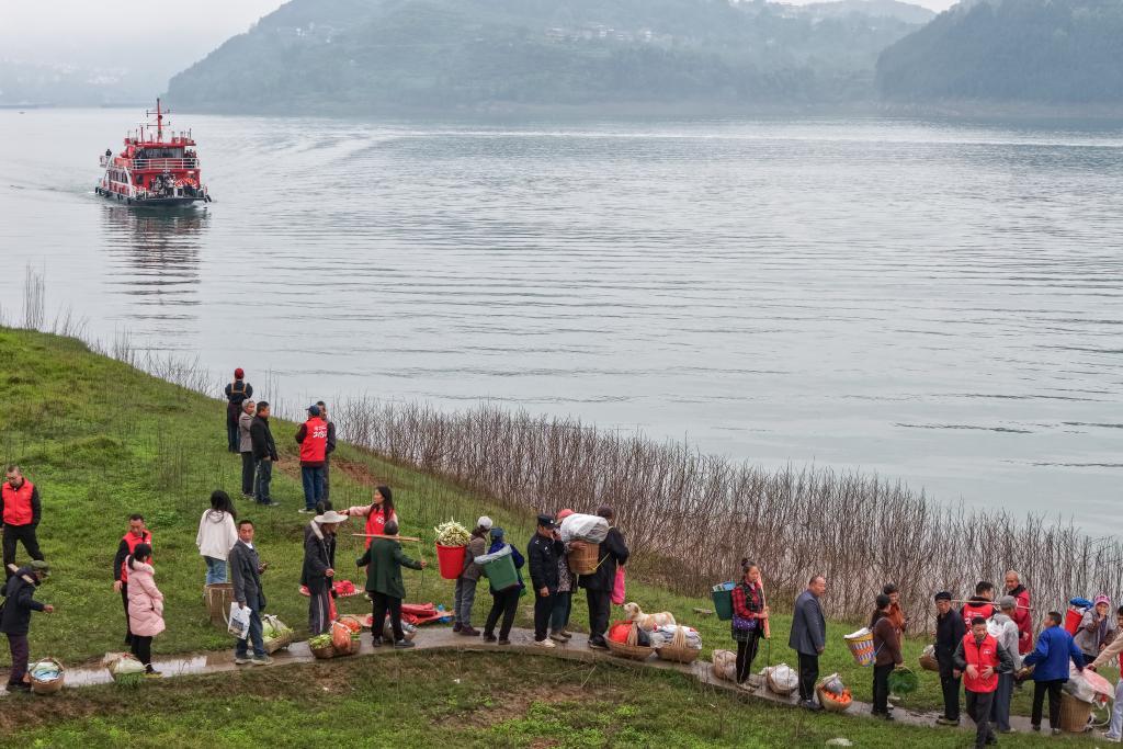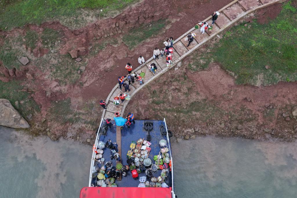 3月31日,在重庆忠县,菜农搭乘“新渝忠客2180”前往县城卖菜(无人机照片)。新华社记者 黄伟 摄