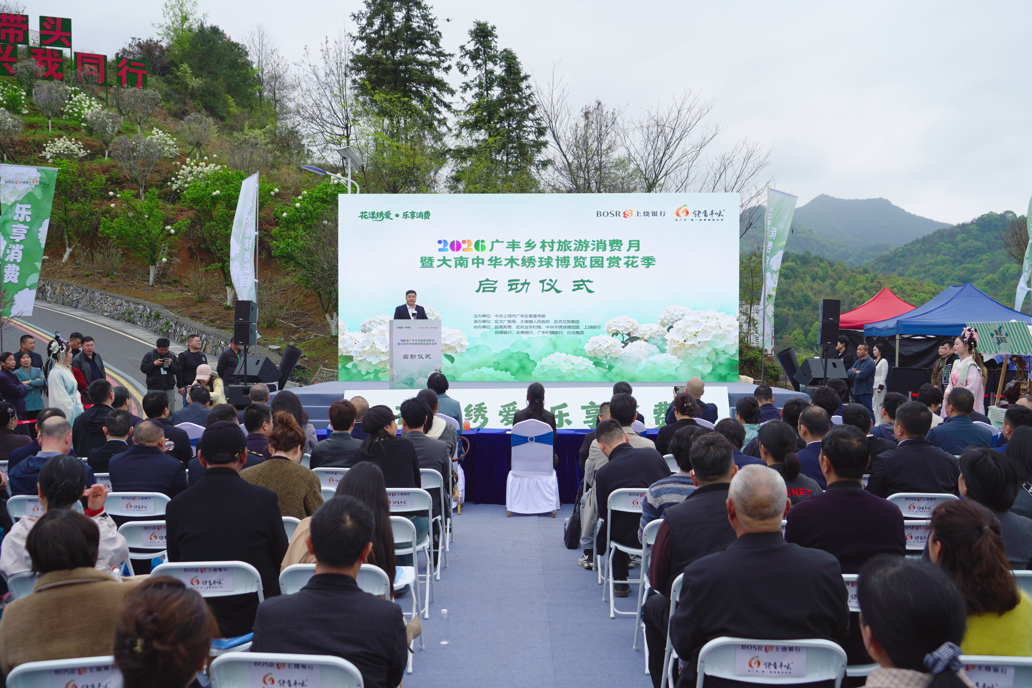 3月31日,“花漾绣爱·乐享消费”——上饶银行2026“饶有丰味”广丰乡村旅游消费月暨大南中华木绣球博览园赏花季启动仪式,在上饶市广丰区大南镇中华木绣球博览园举行。活动以花为媒,正式拉开为期半个月的春季文旅消费盛宴序幕。