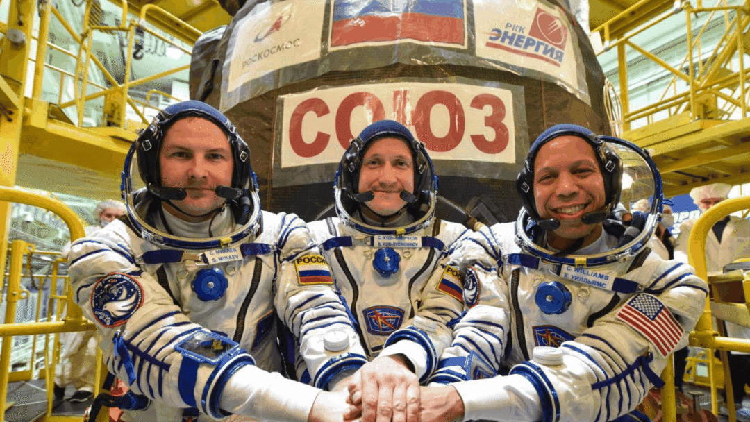 谢尔盖库德斯维尔奇科夫(中)与fellowcosmonaut谢尔盖米卡耶夫(左)以及NASA宇航员克里斯托弗威廉姆斯(右)一同执行太空任务。(图片来源:俄罗斯国家航天集团阿纳多卢通讯社via盖蒂图片)