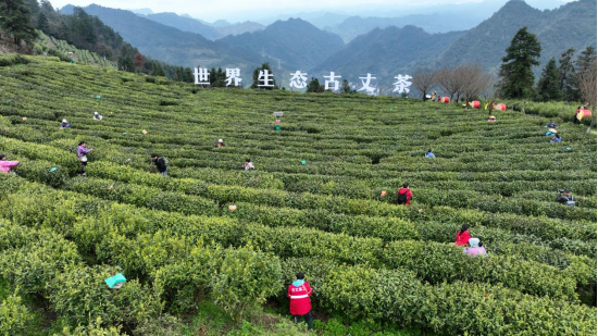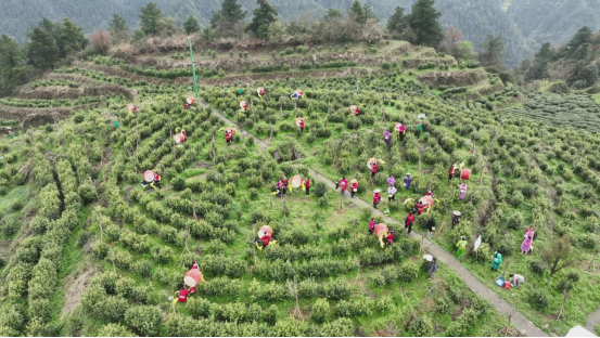 万亩茶树青翠欲滴,苗鼓声声唤醒茶山。活动在《跳香祭茶童子鼓舞》非遗展演中拉开序幕,苗鼓醒山、山歌迎宾的浓郁民俗风情,让现场嘉宾沉浸式感受茶乡古丈的独特魅力。“采茶喽、采茶喽!”伴随阵阵欢歌,高山有机小叶群体茶园正式开园,“采青圣手”古丈茶工手工采茶技能评比火热开始。