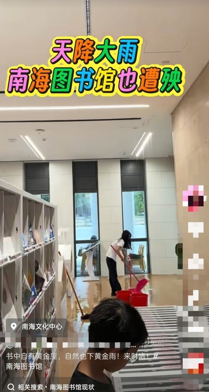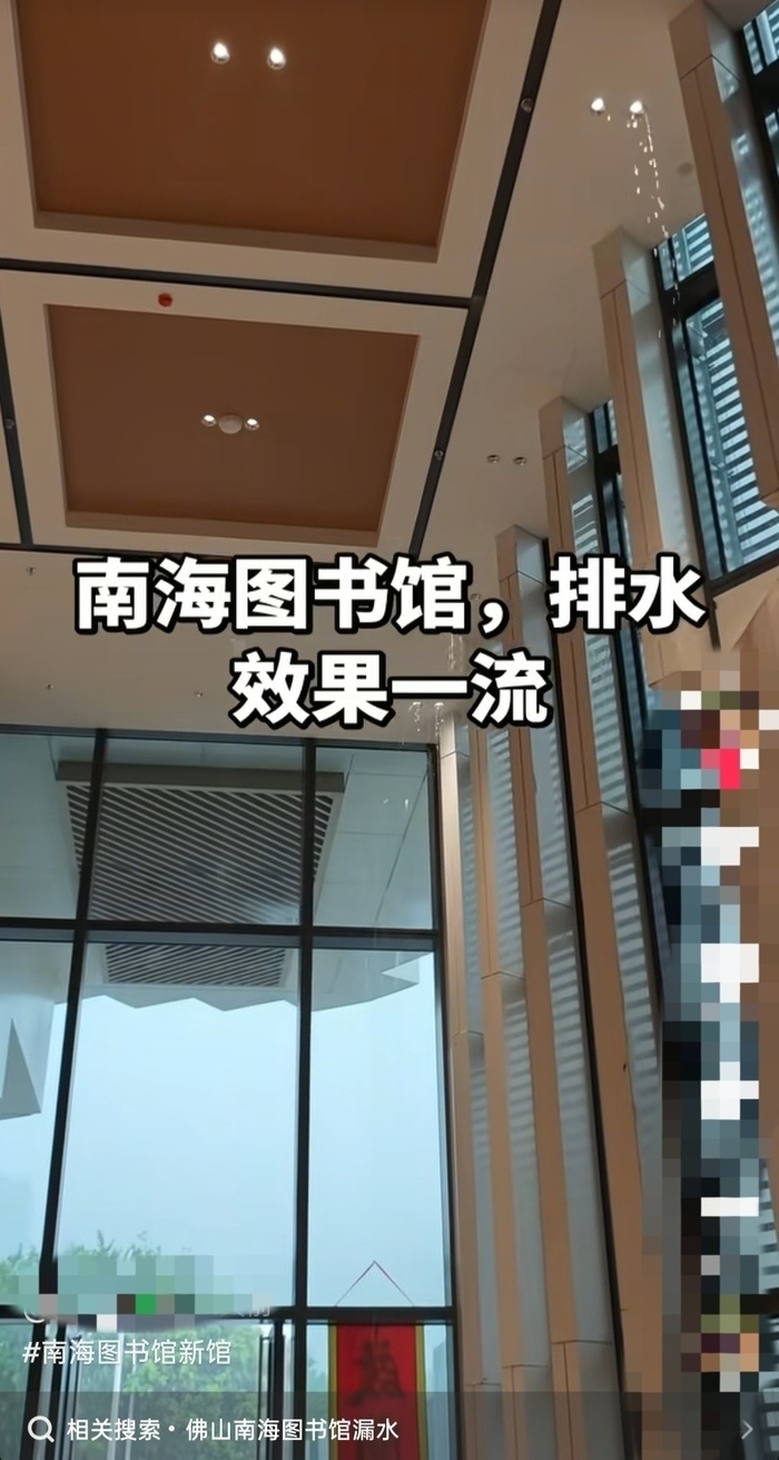 3月29日,佛山遇暴雨天气,有网友发帖称,佛山南海图书馆新馆馆内漏水严重,“天降大雨,南海图书馆也遭殃”。