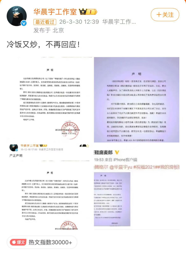 庞麦郎与华晨宇的纠纷则更为典型。2019年,庞麦郎曾质疑华晨宇改编演唱《我的滑板鞋》未获商业演出授权。但华晨宇工作室随即发布声明,指出庞麦郎早在2013-2014年已将歌曲全部著作权独家转让给北京华数文化传媒有限公司,华晨宇的改编及商演行为均获得了版权方(华数传媒)的合法有效授权。