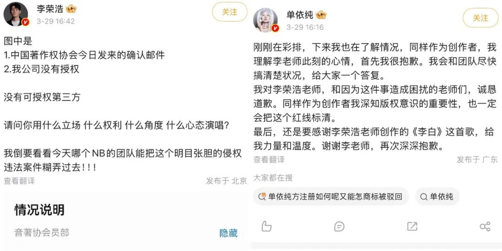 3月29日,第二场演出开始前近5小时,李荣浩在社交平台怒撕单依纯“强行侵权”,他在文中透露:单依纯方曾就翻唱《李白》一事征求授权,而他方已以邮件形式“明确、客气地婉拒”。