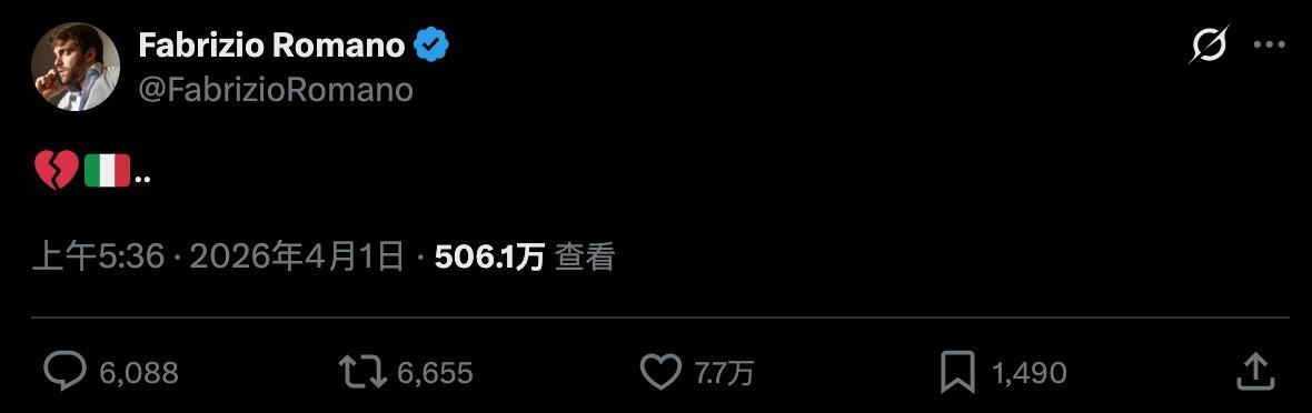 赛后意大利名记、转会专家罗马诺发布社媒。但这条社媒没有文字,只有简单的“💔🇮🇹..”