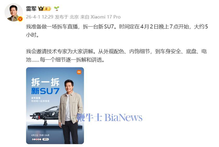 4月1日消息,雷军今日宣布,4月2日19~24时,做一场拆车直播,拆一台新SU7。