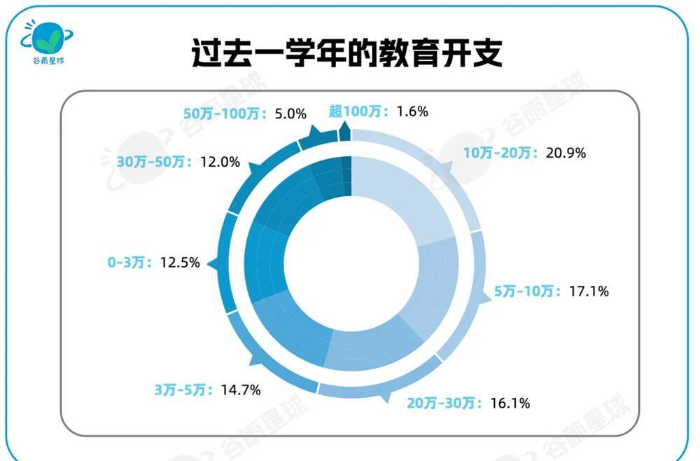 此外,17%的家庭开支在5-10万,3-5万的家庭占比15%,也有1.6%的家庭一年教育开支花了100万。