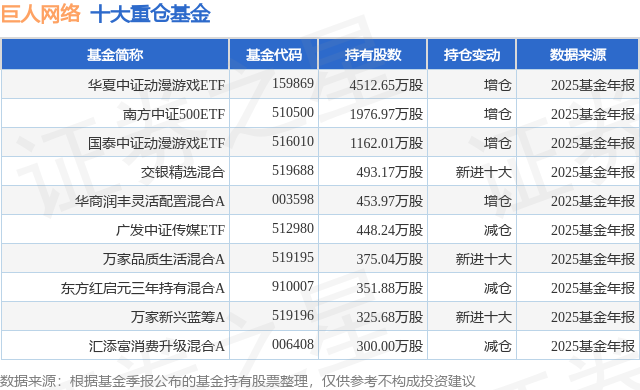 根据2025基金年报公募基金重仓股数据,重仓该股的公募基金共256家,其中持有数量最多的公募基金为华夏基金的华夏中证动漫游戏ETF。华夏中证动漫游戏ETF目前规模为126.11亿元,最新净值1.2648(3月31日),较上一交易日下跌0.75%,近一年上涨12.56%。该公募基金现任基金经理为鲁亚运。鲁亚运在任的基金产品包括:华夏创业板成长ETF联接A,管理时间为2022年6月10日至今,期间收益率为5.52%;华夏中证全指证券公司ETF联接A,管理时间为2022年6月10日至今,期间收益率为12.65%;华夏国证疫苗与生物科技指数发起A,管理时间为2022年9月6日至今,期间收益率为-36.79%;华夏战略新兴成指ETF联接A,管理时间为2023年3月27日至今,期间收益率为29.99%。