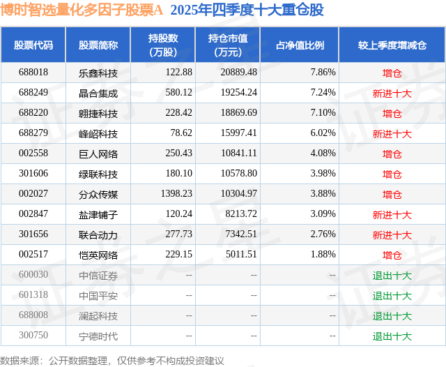 根据2025基金年报公募基金重仓股数据,重仓该股的公募基金共16家,其中持有数量最多的公募基金为博时基金的博时智选量化多因子股票A。博时智选量化多因子股票A目前规模为7.98亿元,最新净值1.0537(3月31日),较上一交易日下跌1.78%,近一年上涨19.26%。该公募基金现任基金经理为刘钊。刘钊在任的基金产品包括:博时中证500指数增强A,管理时间为2020年12月23日至今,期间收益率为28.6%;博时中证500增强策略ETF,管理时间为2023年2月13日至今,期间收益率为46.83%;博时ESG量化选股混合A,管理时间为2023年3月31日至今,期间收益率为37.72%。