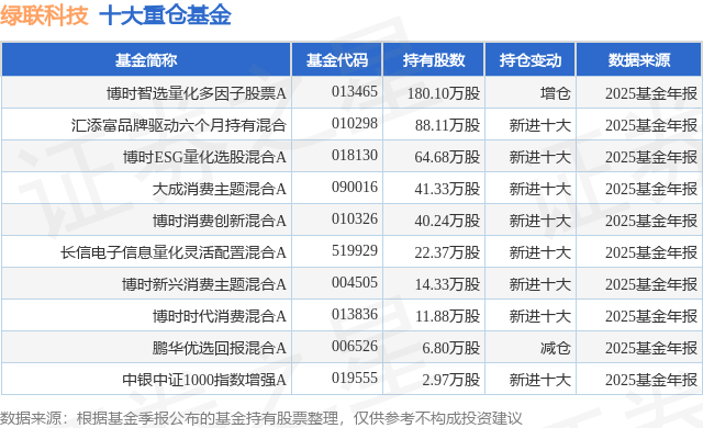 重仓绿联科技的前十大公募基金请见下表: