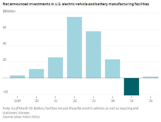 这种不确定性正沿着庞大的汽车供应链传导。麦格纳、德纳、博格华纳等跨国企业因电动车业务收缩而裁员、关厂,一批小型制造商则直接倒闭。追踪清洁能源投资的阿特拉斯公共政策机构数据显示,去年已有超过 200 亿美元此前宣布的电动车及电池工厂投资被取消。