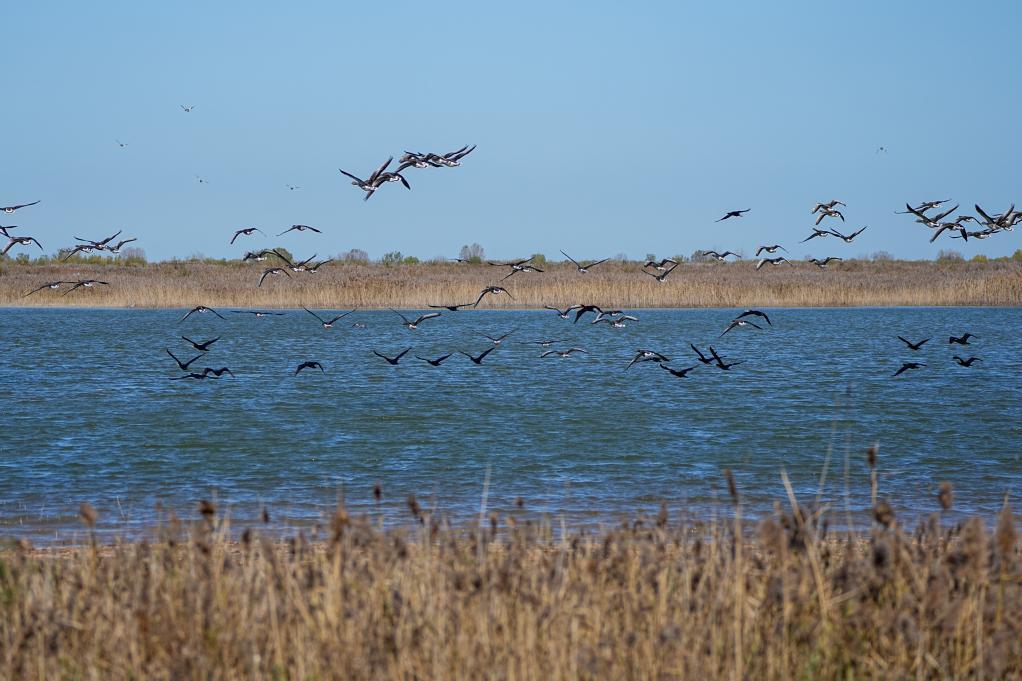 2025年11月13日,山东黄河三角洲国家级自然保护区内,候鸟在飞翔。新华社记者 朱峥 摄