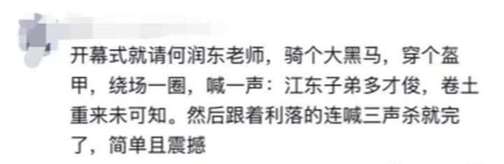 有网友在平台上建议:“开幕式就请何润东老师,骑个大黑马,穿个盔甲,绕场一圈,喊一声:江东子弟多才俊,卷土重来未可知。然后跟着利落地连喊三声‘杀’,就完了,简单且震撼。”许多网友纷纷点赞或留言支持。而“宿迁文旅”也马上回应:“静候霸王回家。”