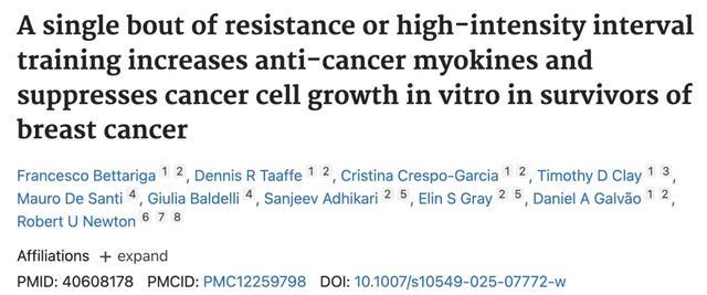 2025年7月发表在《乳腺癌研究和治疗》期刊上的研究发现,做抗阻运动(针对大肌群的力量训练)的人群,运动后“抗癌蛋白”水平显著升高了9%~47%,且癌细胞生长被抑制了20%~21%。